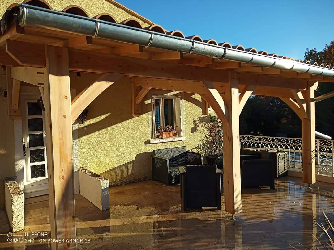 Notre équipe de charpentier à réalisé cette belle charpente dans le but de créer un coin abrité sur une grande terrasse. Cela permet de se mettre à l'abris en cas d'intempéries ou à l'ombre en été et ainsi profiter plus longtemps de sa terrasse.