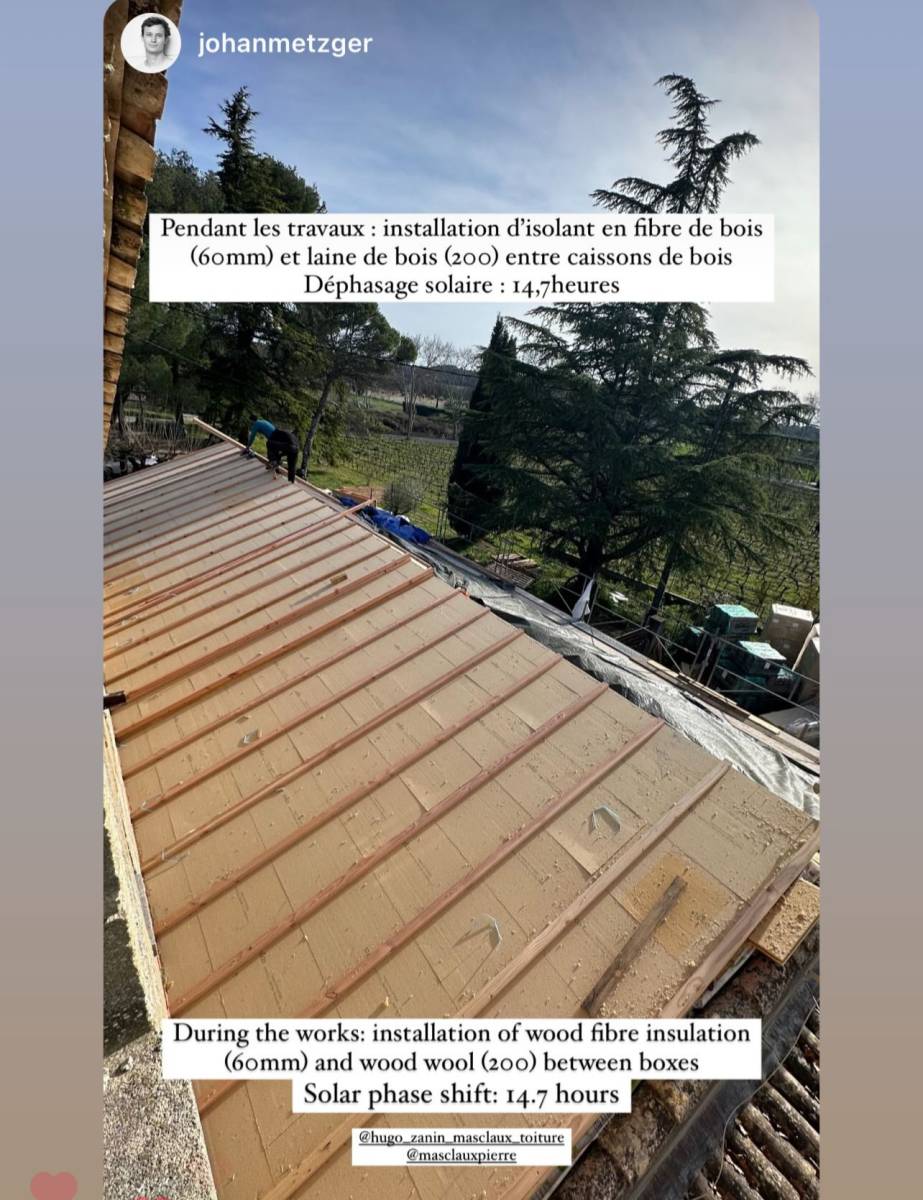 Lors de la réalisation de la charpente et de la couverture sur un Mas à Uzès, nous avons opté pour une isolation en surtoiture de haute qualité, avec 200 mm de laine de bois souple et 60 mm de laine de bois rigide.