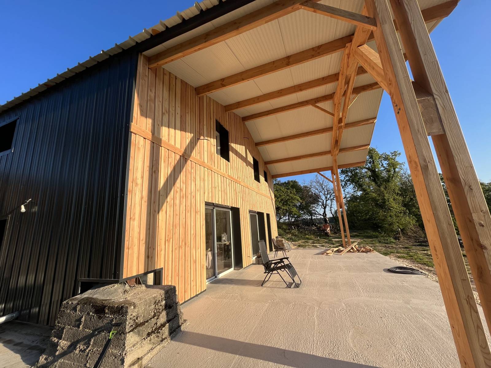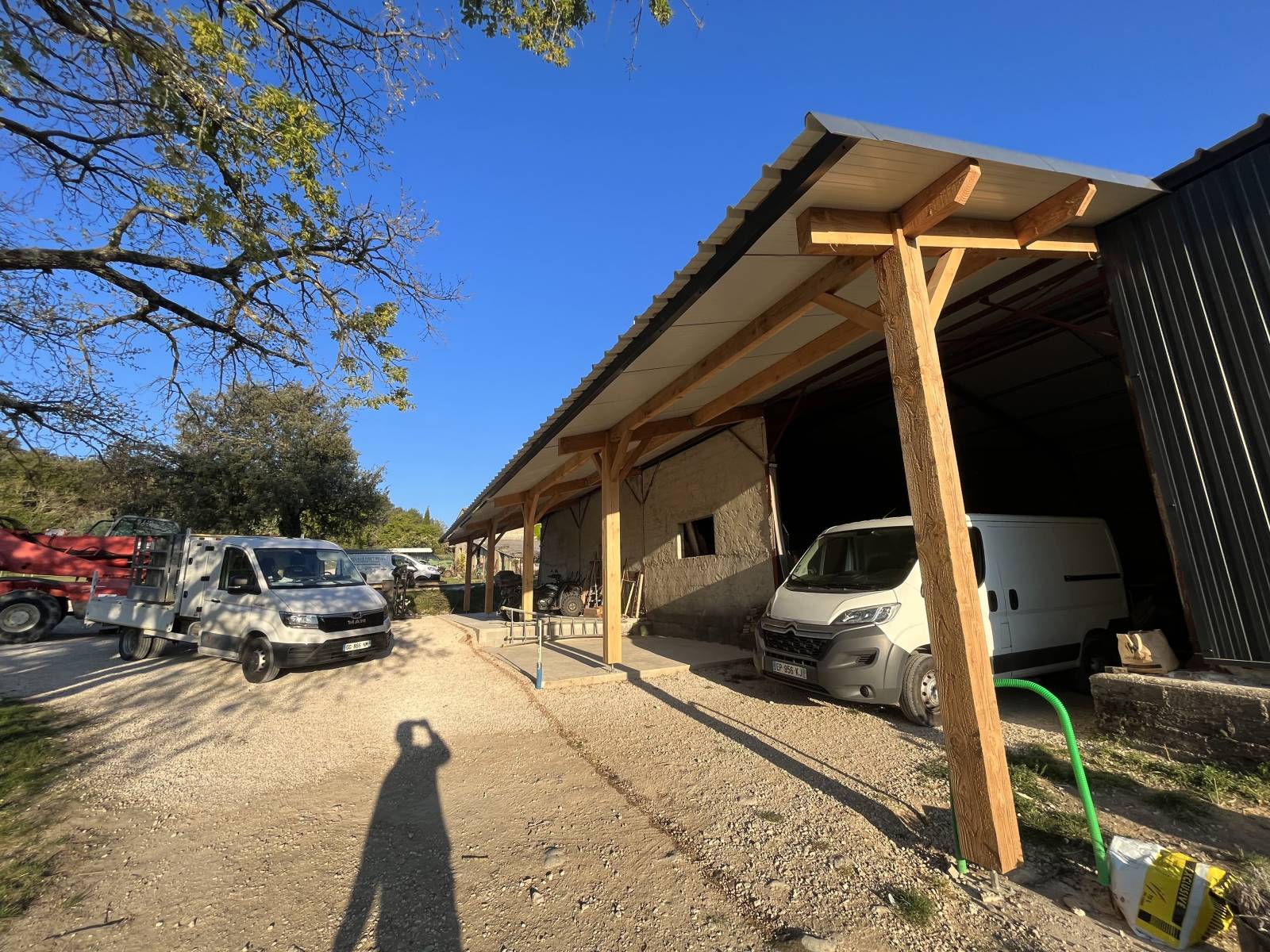 Le but était d'agrandir et de transformer le hangar en maison d'habitation à Vallérargues à coté d'Uzès. Pour réaliser cela proprement les façades ont été habillées en bardage bois.
