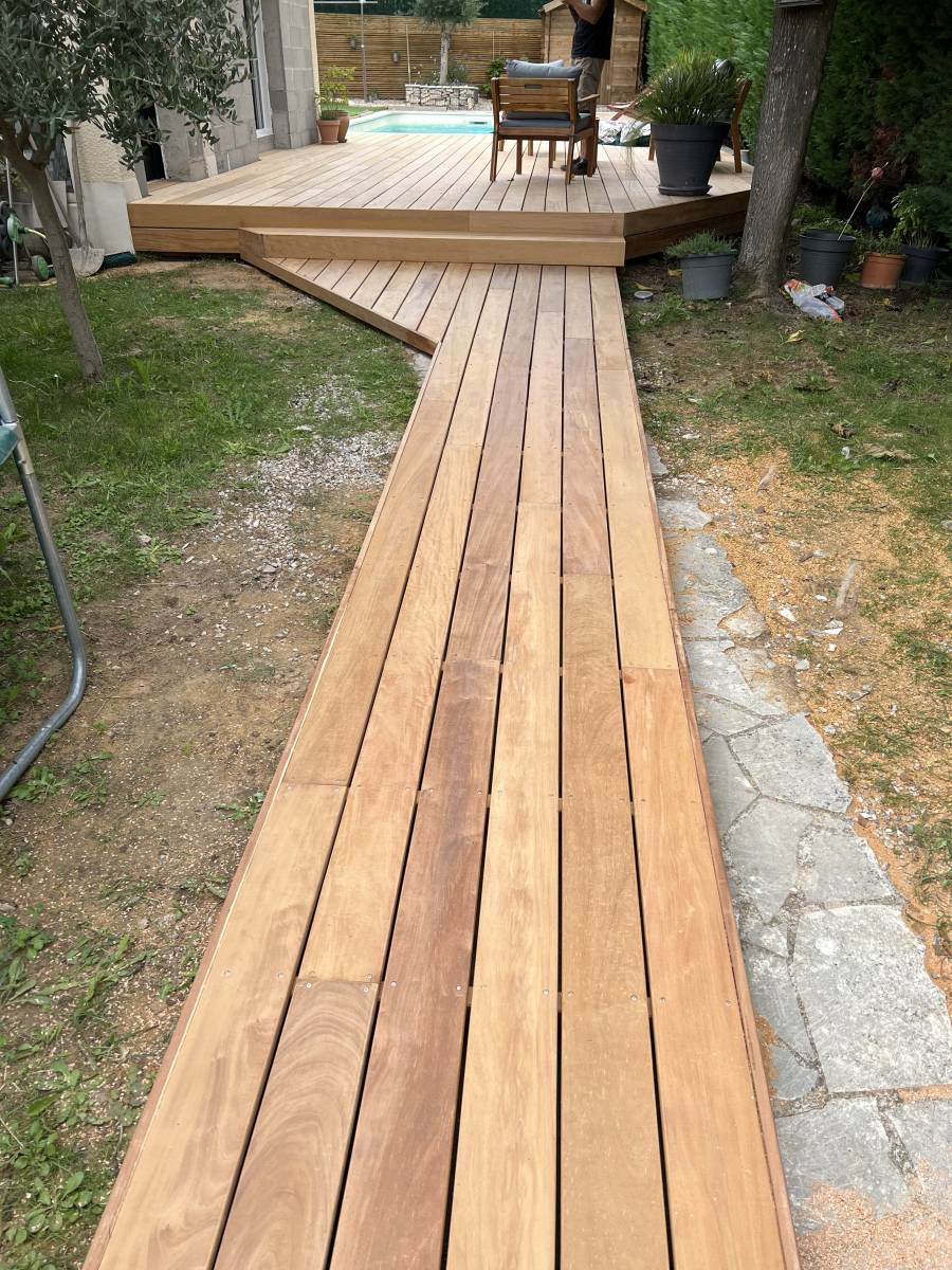 Ici notre client souhaitait sublimer son extérieur et créer un espace chaleureux autour de sa piscine. Avec cette terrasse en bois de GARAPA, le résultat est incroyable. Simplicité, matériaux naturel et noble, donne un cachet à votre extérieur