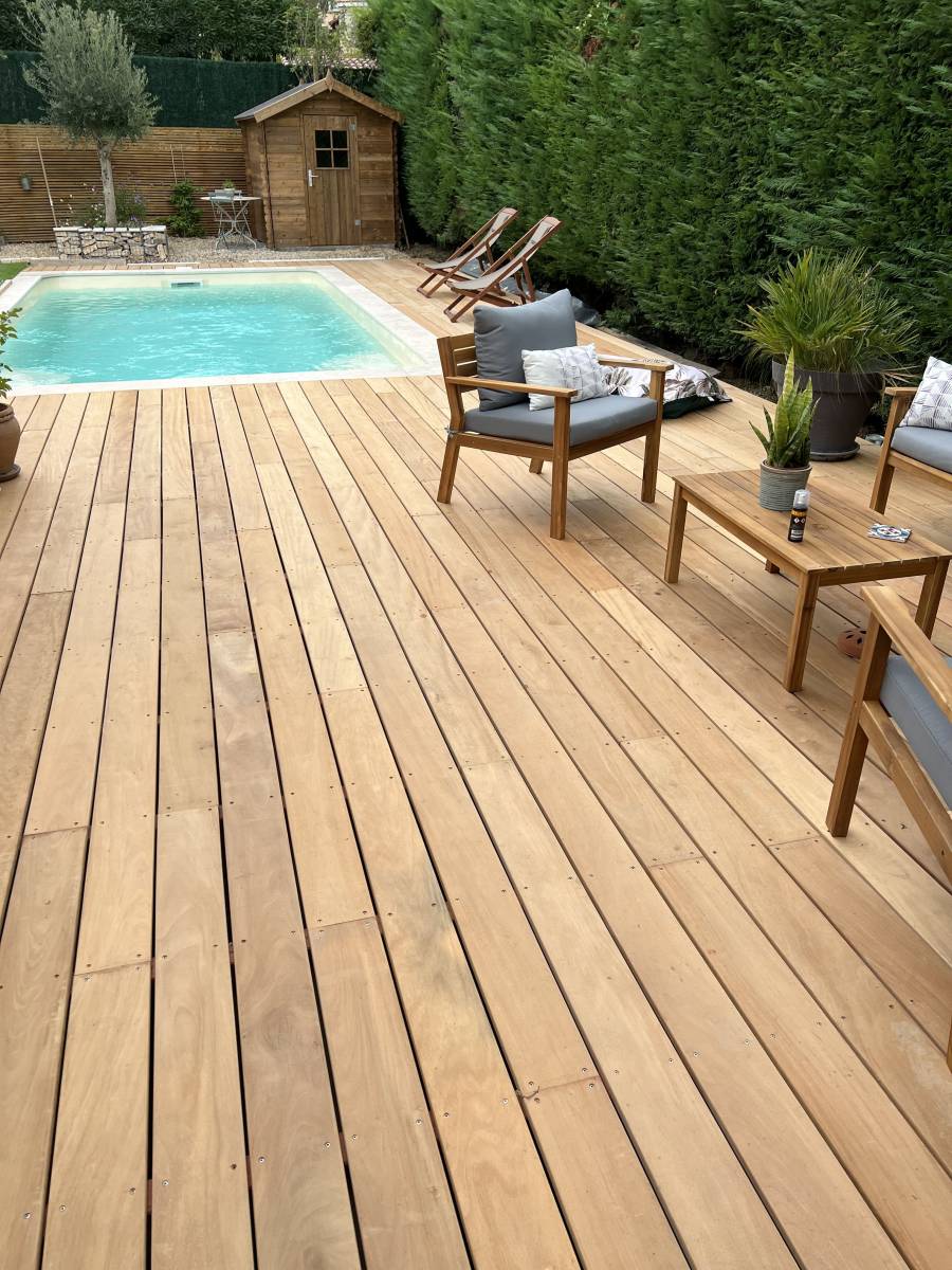 L'entreprise Masclaux toiture a réalisé l'aménagement extérieur de cette piscine à Nîmes. Pour la réalisation de cette terrasse, nous avons choisi un bois exotique, le Garapa. Ce bois très résistant permet une durabilité dans le temps à toute épreuve.
