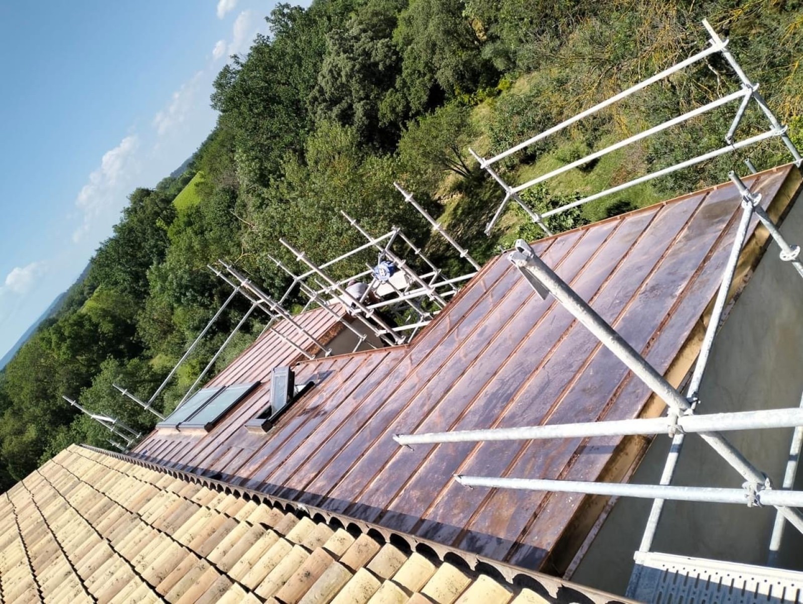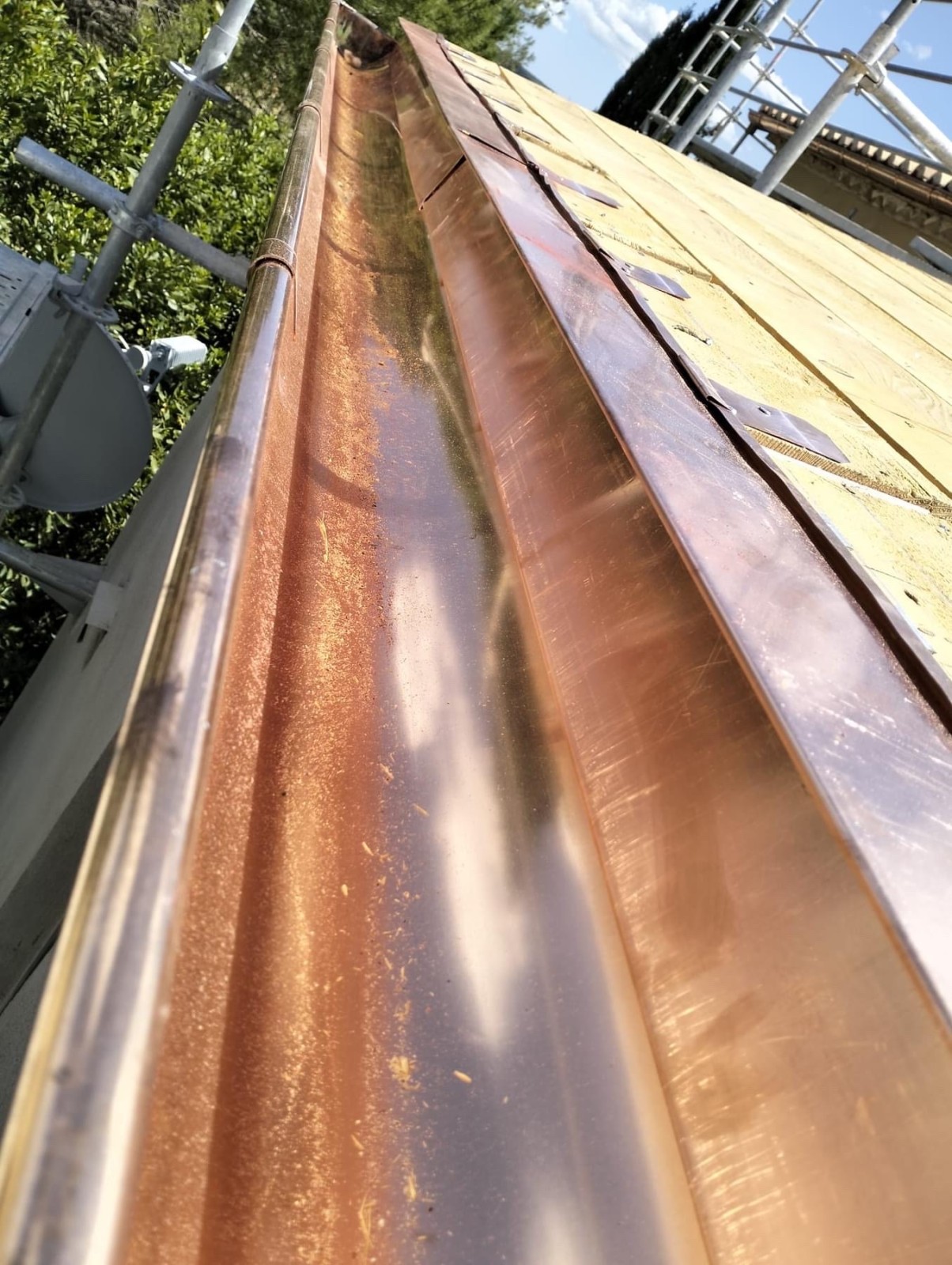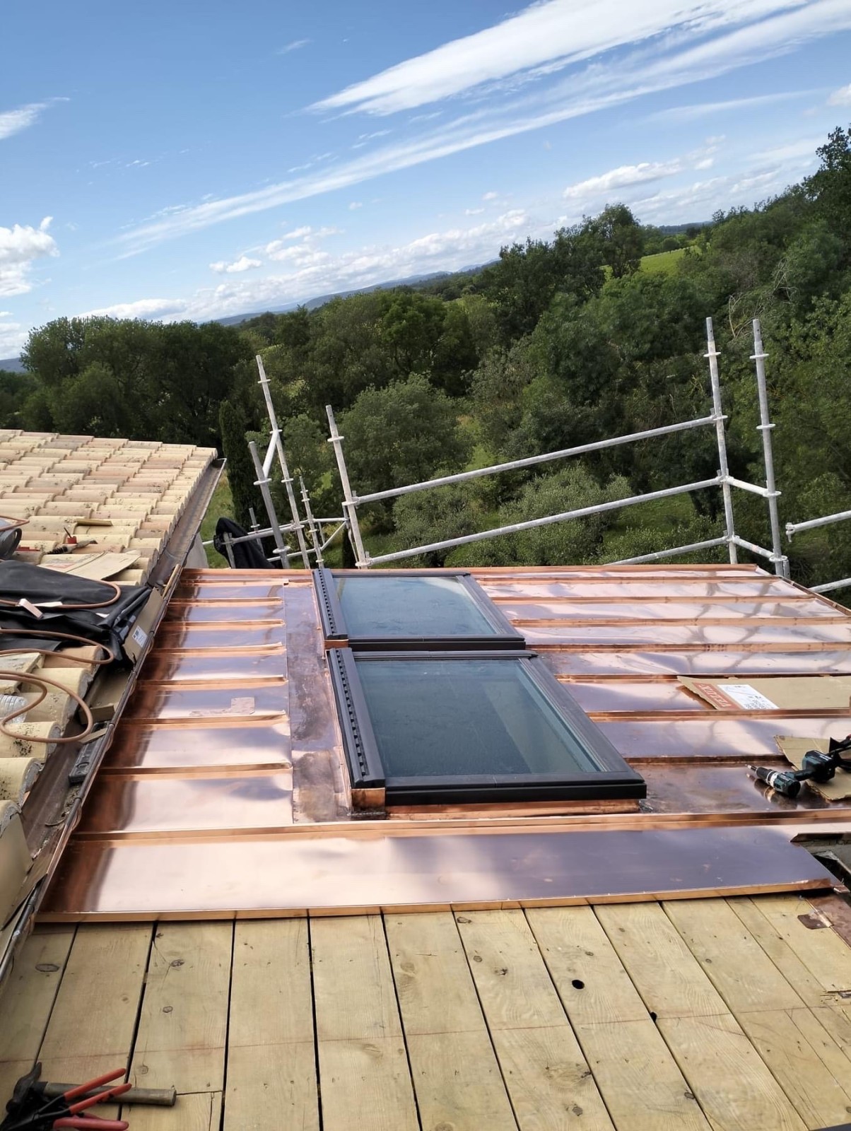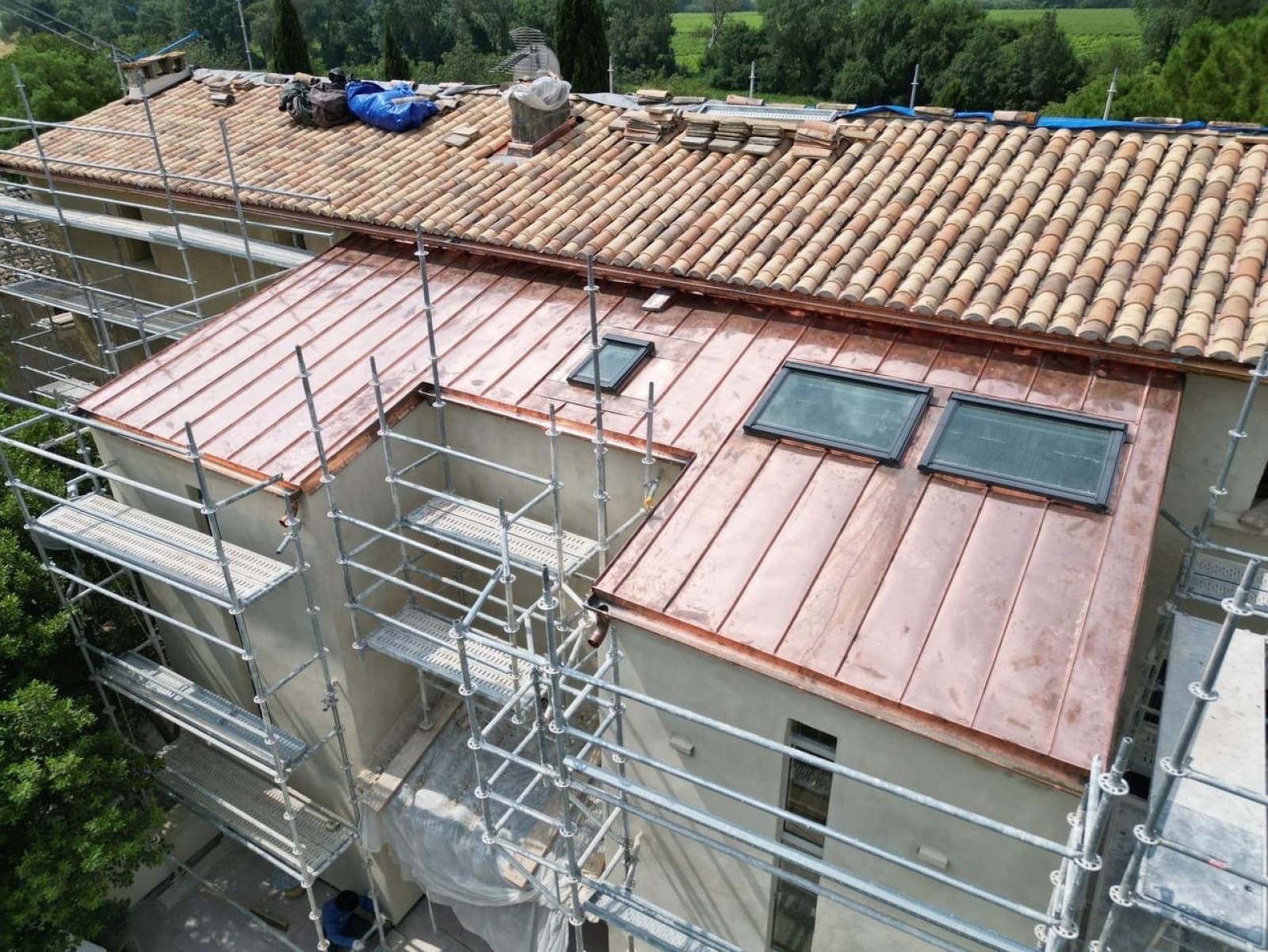 Après la réfection de l'ensemble des toitures en tuile, nous avons récemment réalisé une couverture en joint debout en cuivre sur un domaine situé à Junas dans le Gard . Ce choix de matériau et de technique a été fait pour allier esthétique et durabilité. Le cuivre, avec ses qualités résistantes et sa patine unique, apporte une touche élégante et intemporelle à la toiture. Le joint debout en cuivre assure une étanchéité parfaite, garantissant ainsi la protection et la longévité de la structure tout en rehaussant son aspect prestigieux. Bravo les Zingueurs, c'est du beau boulot.
